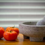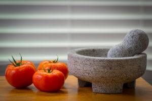 mortar, pestle, and tomatoes on a table